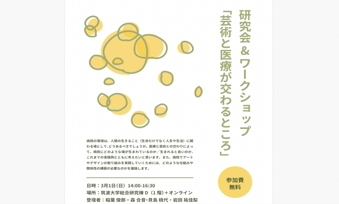 筑波大学主催の「研究会&ワークショップ『芸術と医療が交わるところ』 に、当NPO代表の 森 合音 が登壇いたします。