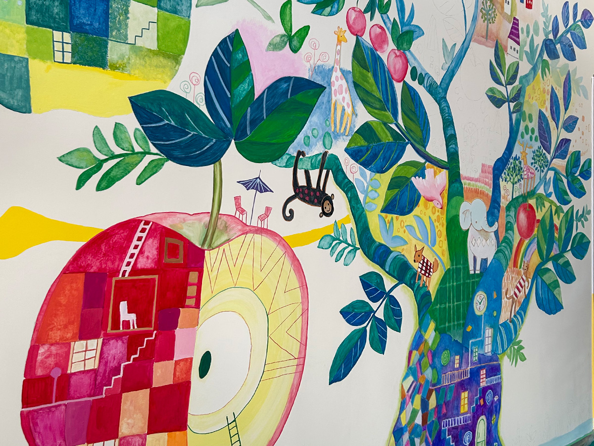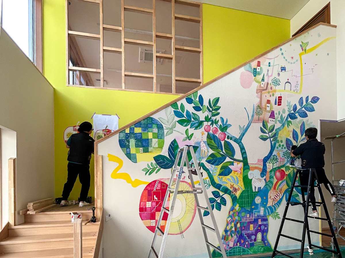 実際に壁面に描いた職人さんが「こどものような心を持っていないと、こんな風に描けない」と思わず口にされたように、今作品からはフルイさんのこどもの世界に向けた真摯であたたかいまなざしを感じることができます。また、制作現場を訪れたフルイさんがその再現性の高さに大変驚いておられたことも覚えておきたいと思います。