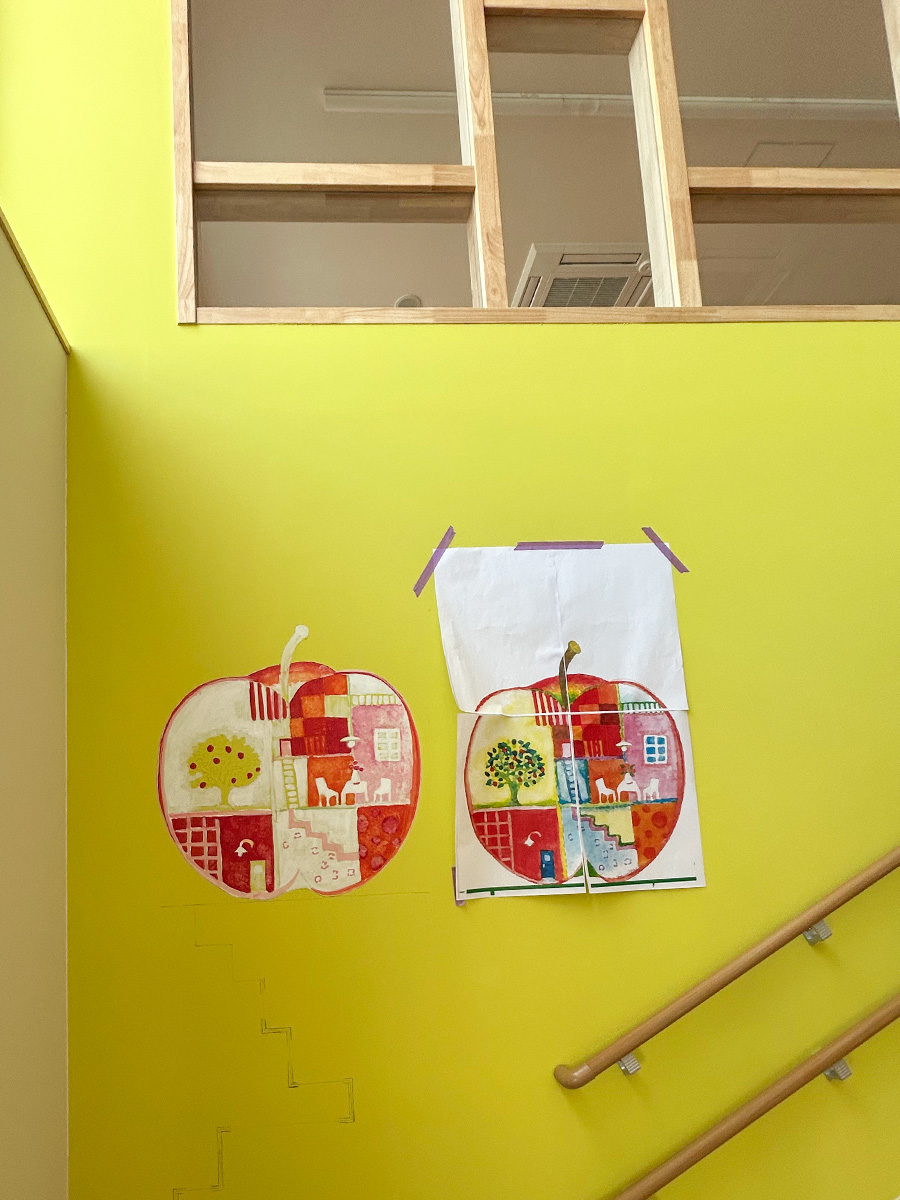 エントランスホールはこどもたちだけでなく、ご家族みんなを温かく迎える大切な場所です。今作品が日々の親子の時間に寄り添い、心に残る風景となって、こどもたちのこれからの歩みを勇気づけることができるなら、これほど嬉しいことはありません。