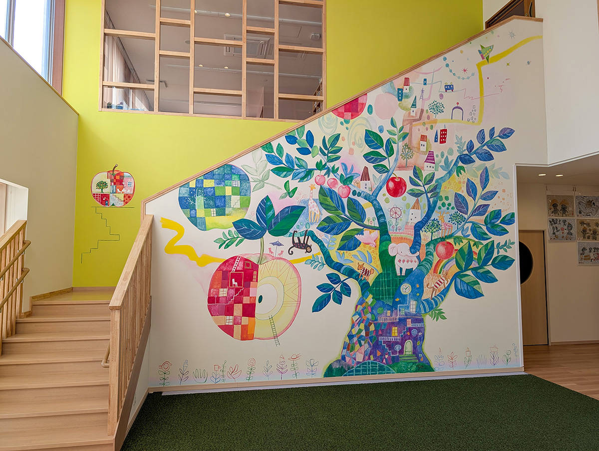 エントランスホールはこどもたちだけでなく、ご家族みんなを温かく迎える大切な場所です。今作品が日々の親子の時間に寄り添い、心に残る風景となって、こどもたちのこれからの歩みを勇気づけることができるなら、これほど嬉しいことはありません。